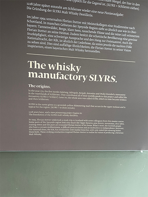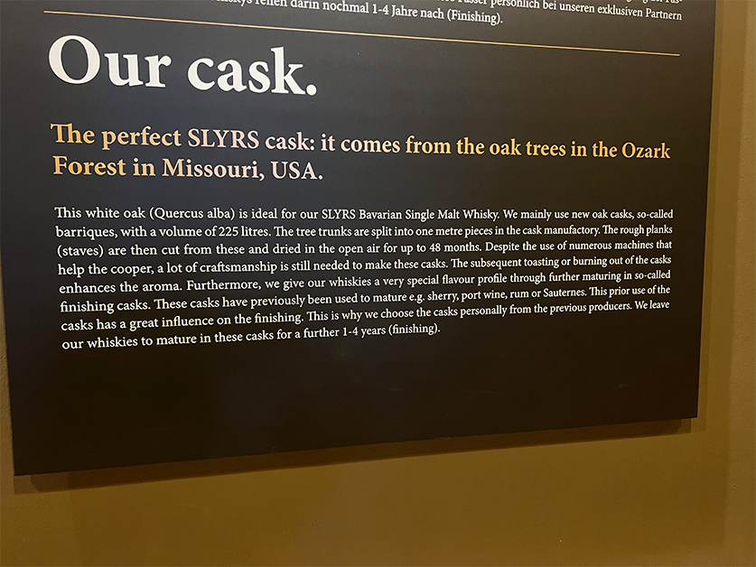 I walked downstairs to the Distillery Store to find out about doing a tour. They are in process of doing an expansion so they had a self-guided tour I could take which I was thrilled with. I’ve toured a number of distilleries, so I know how the process works but I wanted to see the unique elements of Slyrs. They have panels of information in both German and English which was very helpful given my German is very rusty!